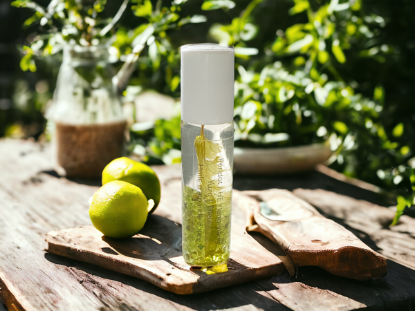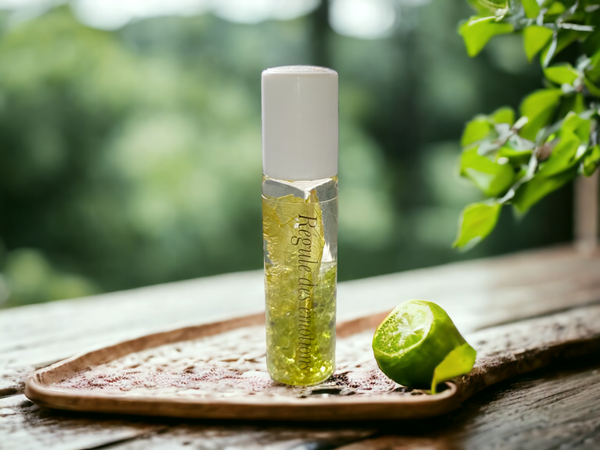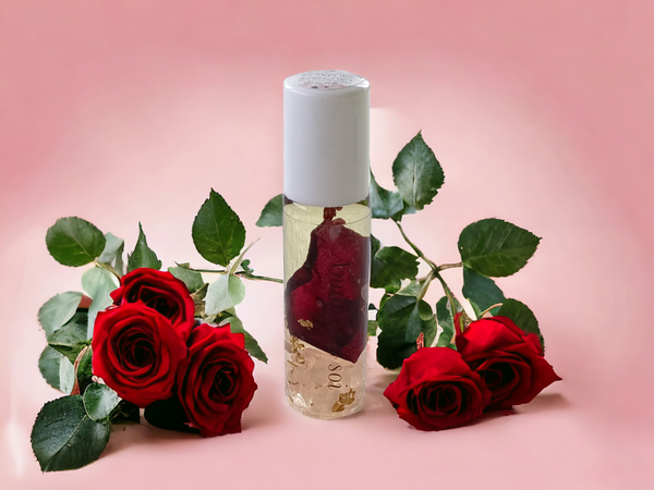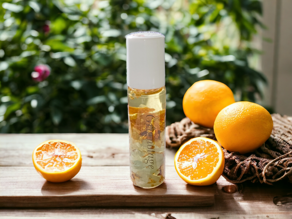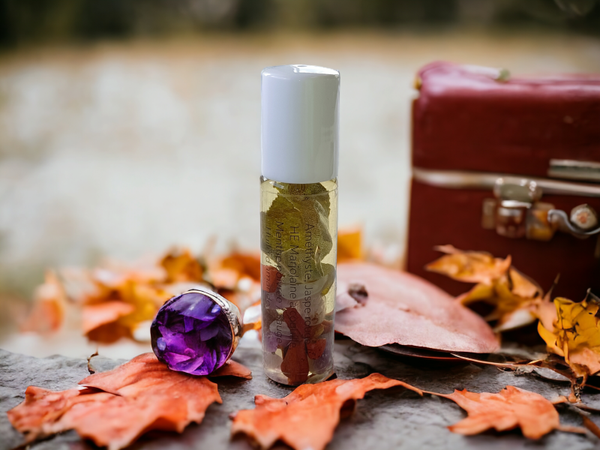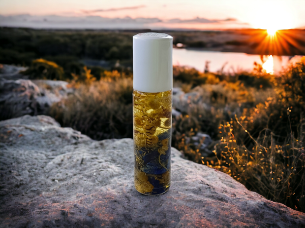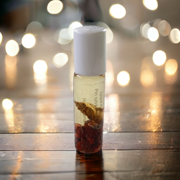 9 Roll-ons composés d'huile d'amande douce, pierres naturelles, huiles essentielles et fleurs / plantes séchées.